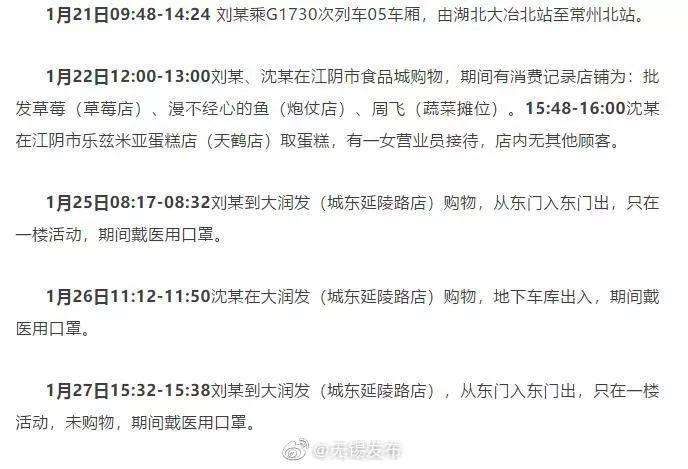 無(wú)錫江陰新型冠狀病毒感染的肺炎確診病例2劉某、病例3沈某(為病例2的兒媳),目前兩人均在市定點(diǎn)醫(yī)院隔離治療,病情穩(wěn)定 。在流行病學(xué)調(diào)查時(shí),發(fā)現(xiàn)劉某、沈某有以下出入公共場(chǎng)所活動(dòng)軌跡,現(xiàn)緊急尋找相關(guān)接觸人員。