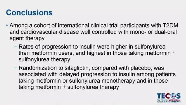 TECOS試驗亞組分析結果表明,在接受二甲雙胍單藥治療和二甲雙胍+磺脲類聯合治療的2型糖尿病患者中,加用西格列汀可使因病情進展需胰島素治療的時間延遲。
